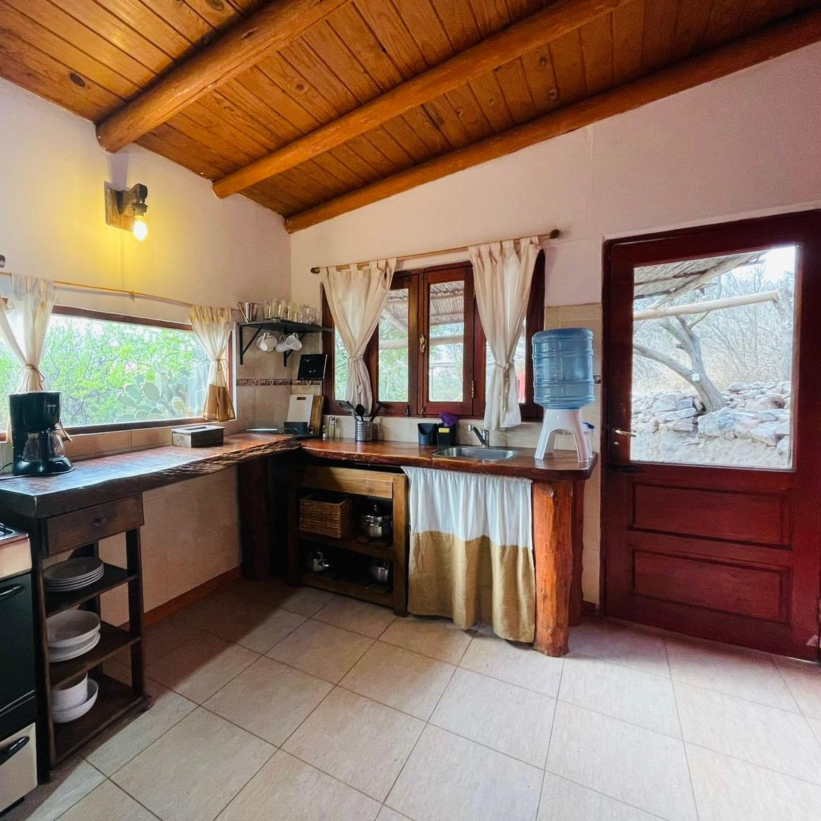 . Cocina con vajilla, heladera con freezer, cocina con horno.