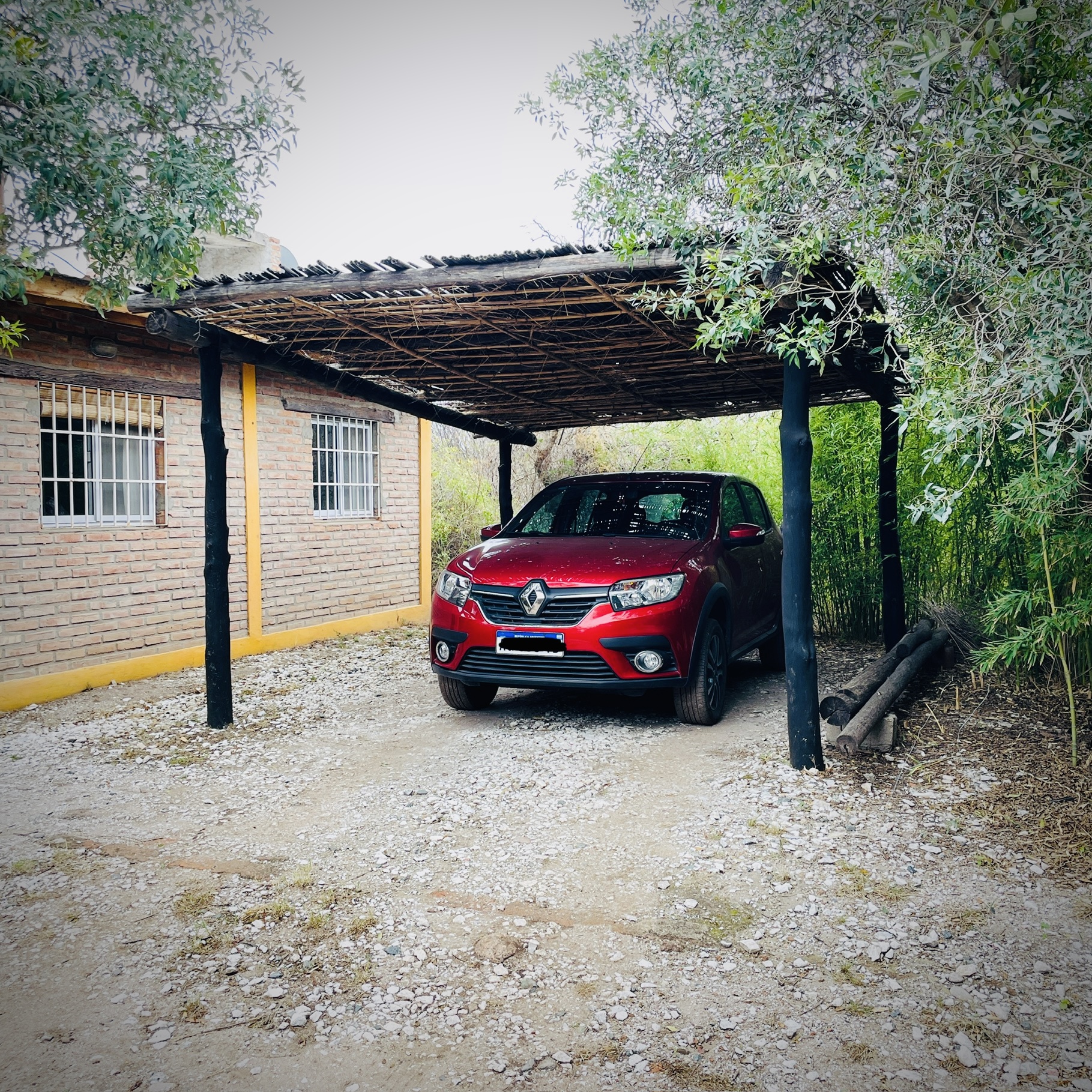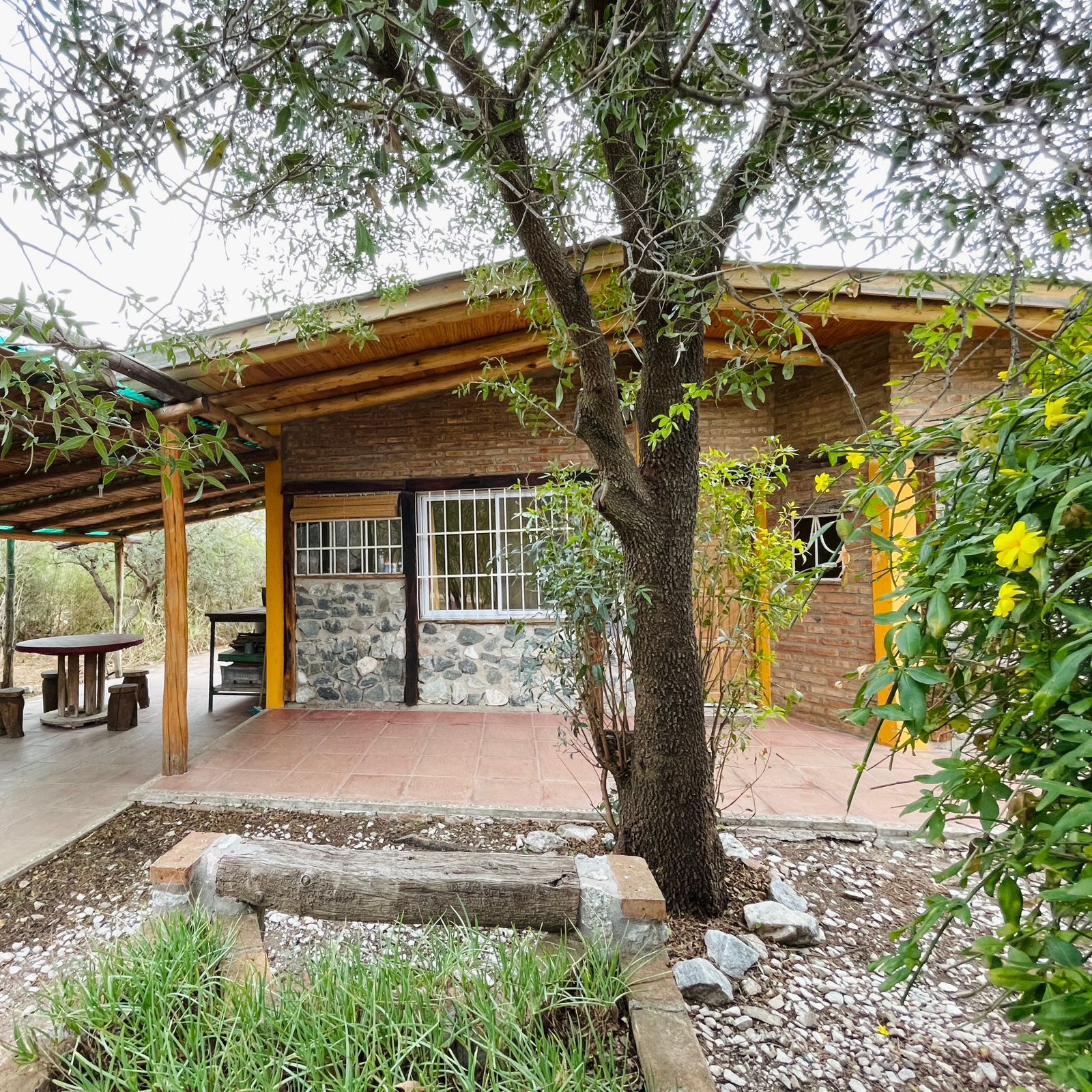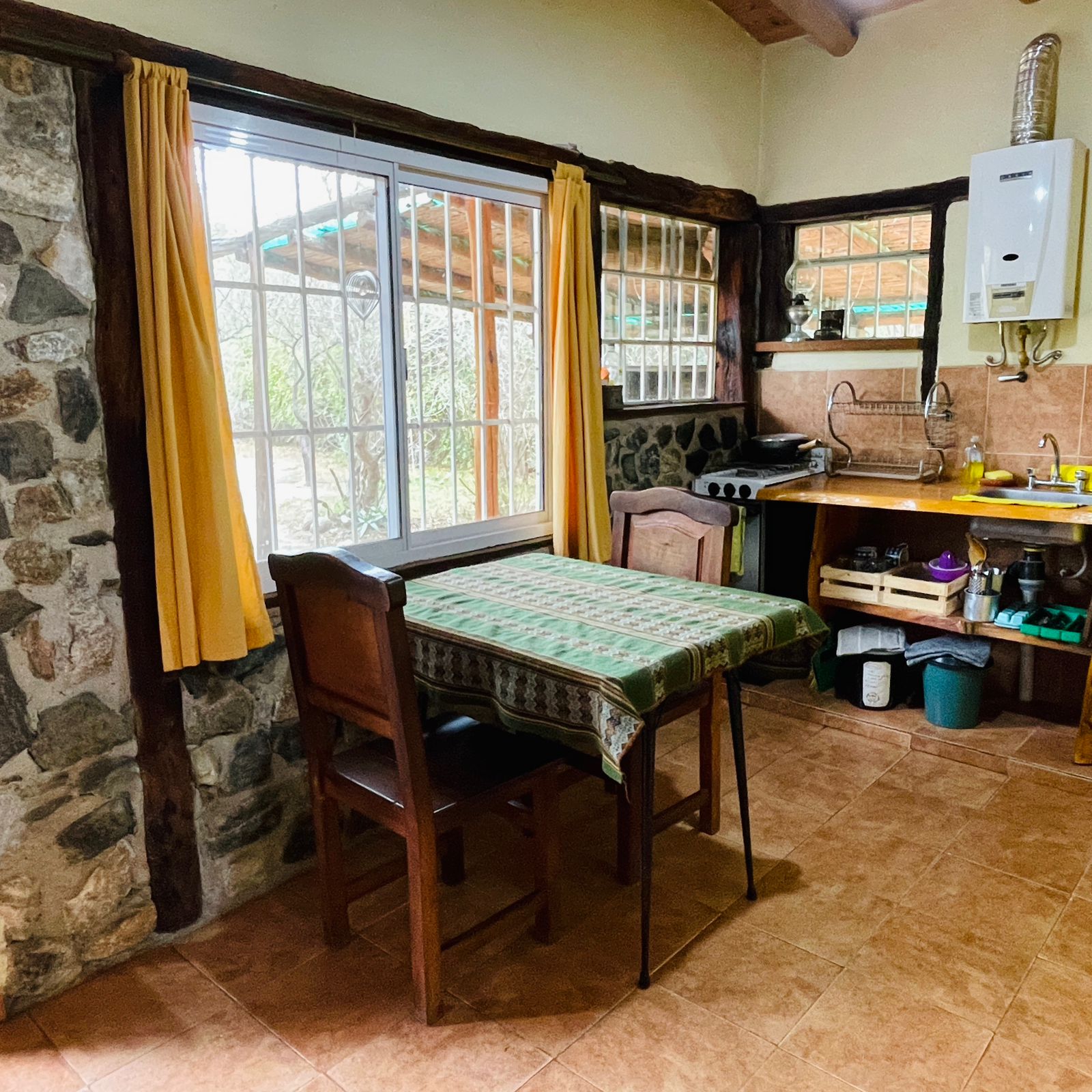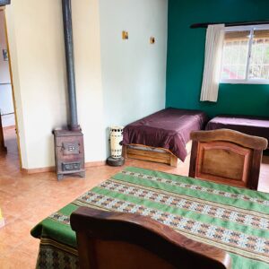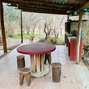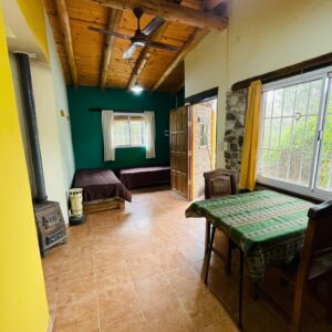 . A 10 cuadras de la plaza y el río en un entorno de mucha paz, rodeada de monte nativo. . . Casa con una habitación con cama doble, otro ambiente con dos camas individuales, baño, cocina completa, galería techada con parrilla y estacionamiento techado para auto/camioneta.