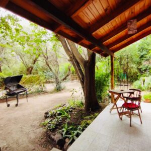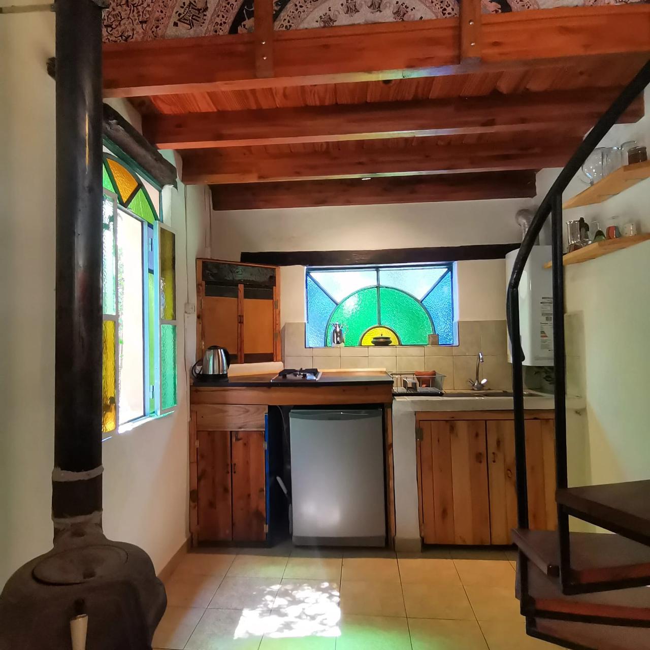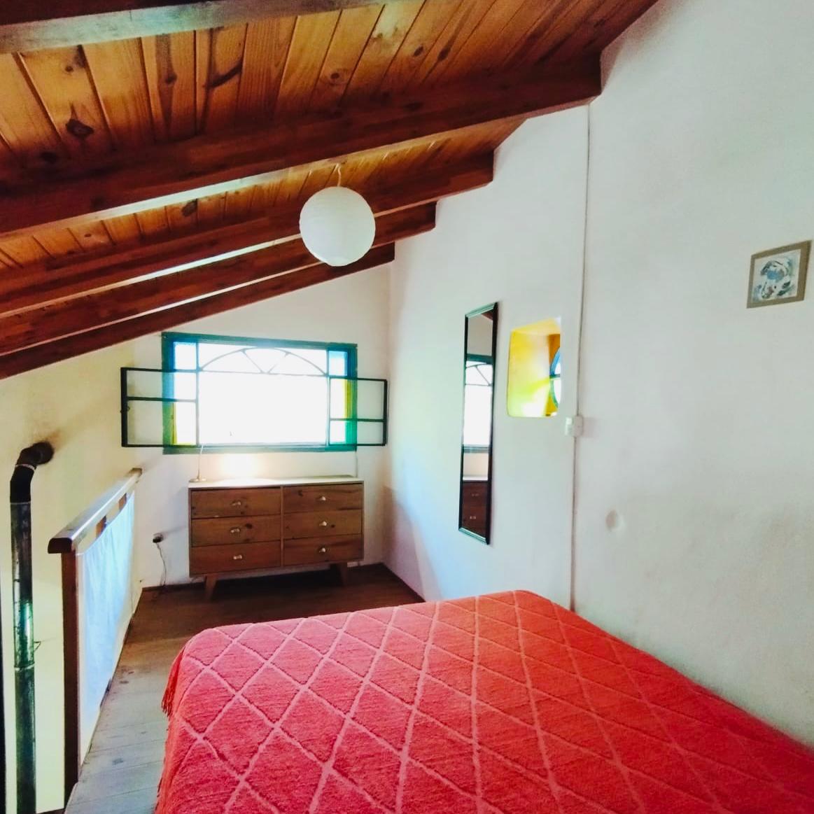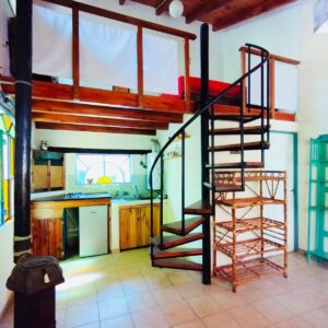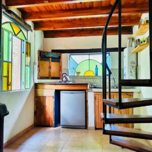 . Casita dúplex con cama matrimonial en primer piso, cocina completa y baño.